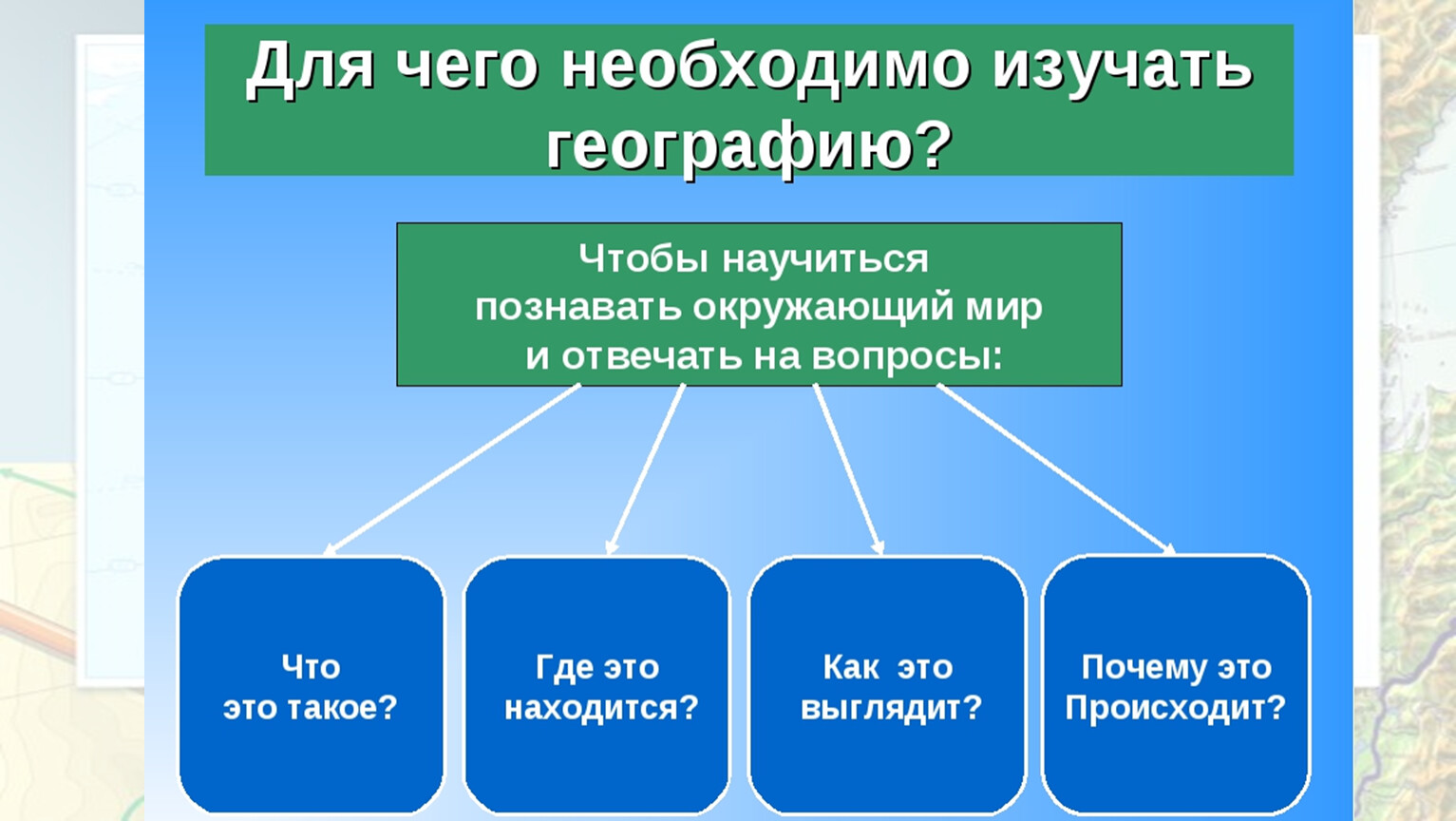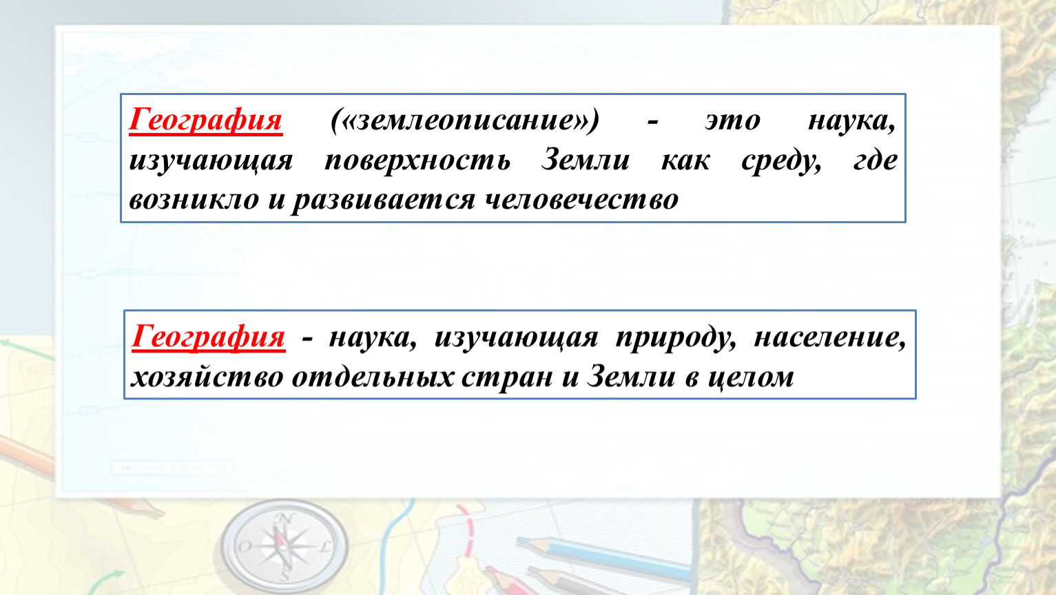 География («землеописание») - это наука, изучающая поверхность Земли как среду, где возникло и развивается человечество