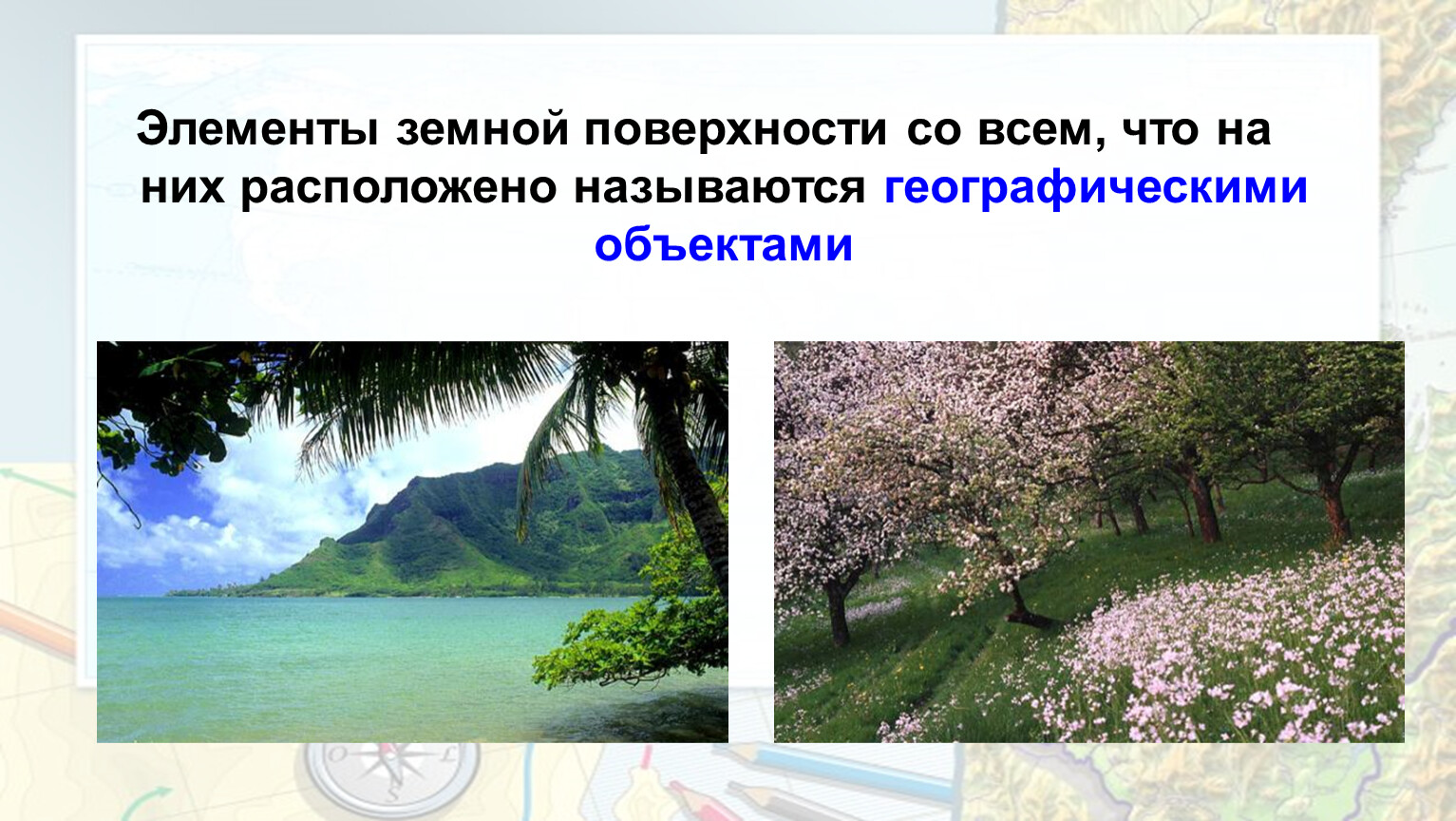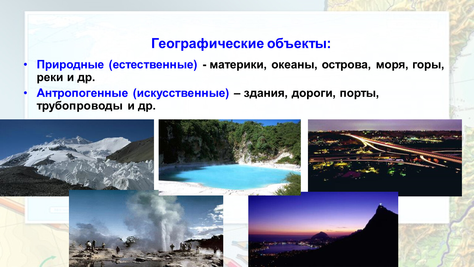 Природные (естественные) - материки, океаны, острова, моря, горы, реки и др.