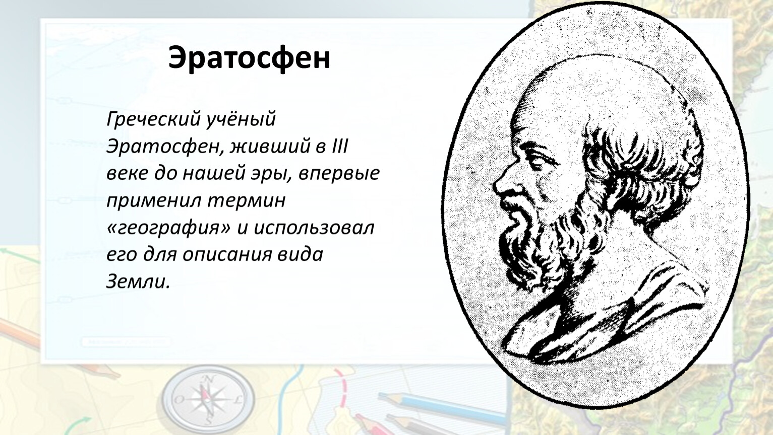 Греческий учёный Эратосфен, живший в III веке до нашей эры, впервые применил термин «география» и использовал его для описания вида Земли.