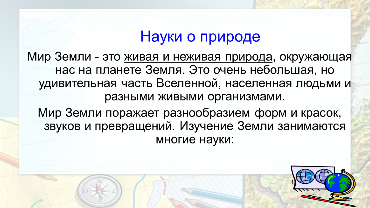 Мир Земли поражает разнообразием форм и красок, звуков и превращений. Изучение Земли занимаются многие науки: