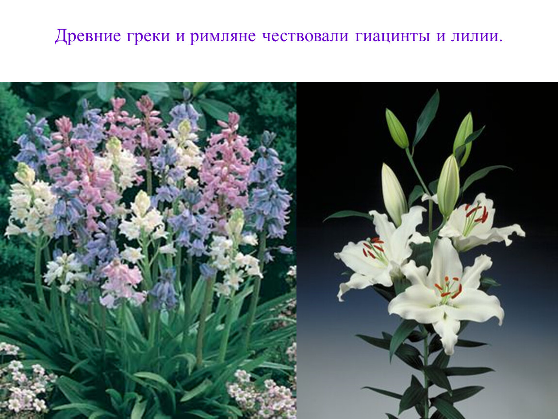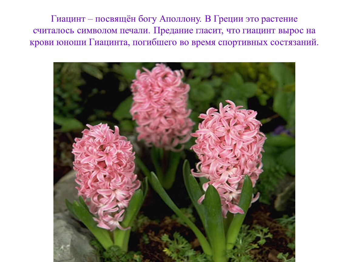 Гиацинт – посвящён богу Аполлону. В Греции это растение считалось символом печали. Предание гласит, что гиацинт вырос на крови юноши Гиацинта, погибшего во время спортивных состязаний.