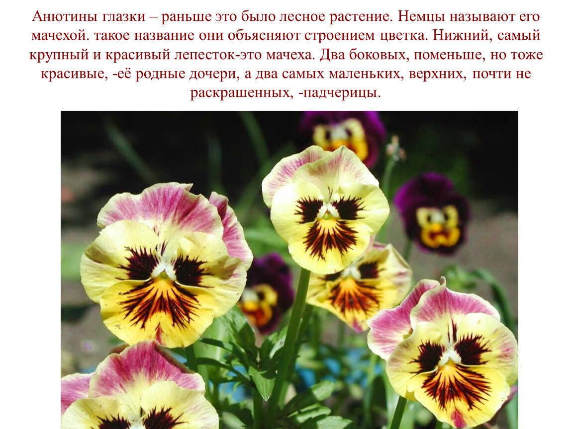 Анютины глазки – раньше это было лесное растение. Немцы называют его мачехой. такое название они объясняют строением цветка. Нижний, самый крупный и красивый лепесток-это мачеха. Два боковых, поменьше, но тоже красивые, -её родные дочери, а два самых маленьких, верхних, почти не раскрашенных, -падчерицы.