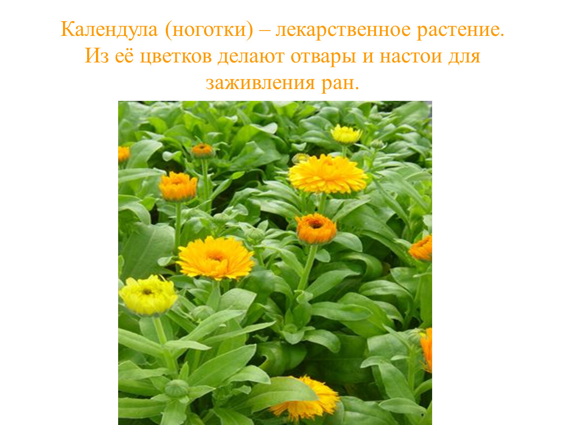Календула (ноготки) – лекарственное растение. Из её цветков делают отвары и настои для заживления ран.
