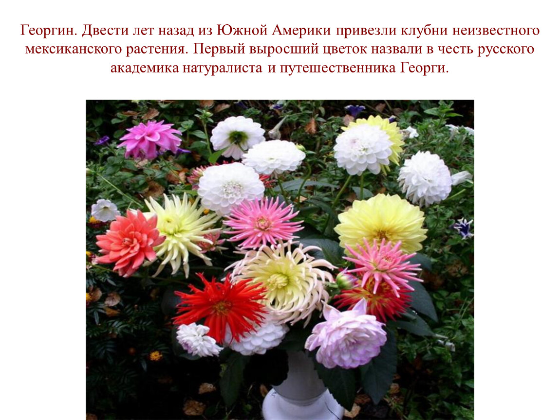 Георгин. Двести лет назад из Южной Америки привезли клубни неизвестного мексиканского растения. Первый выросший цветок назвали в честь русского академика натуралиста и путешественника Георги.