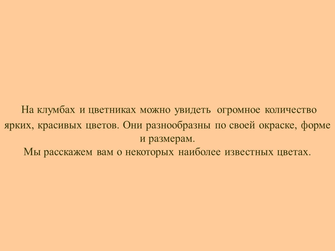 На клумбах и цветниках можно увидеть огромное количество ярких, красивых цветов. Они разнообразны по своей окраске, форме и размерам.Мы расскажем вам о некоторых наиболее известных цветах.