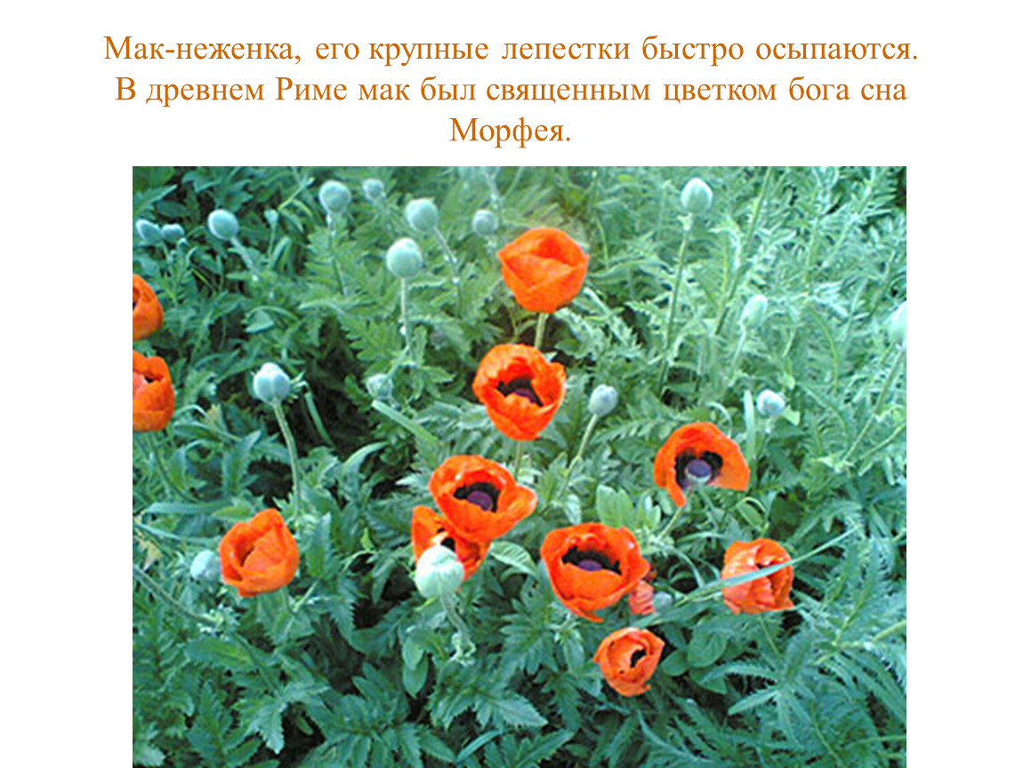 Мак-неженка, его крупные лепестки быстро осыпаются. В древнем Риме мак был священным цветком бога сна Морфея.