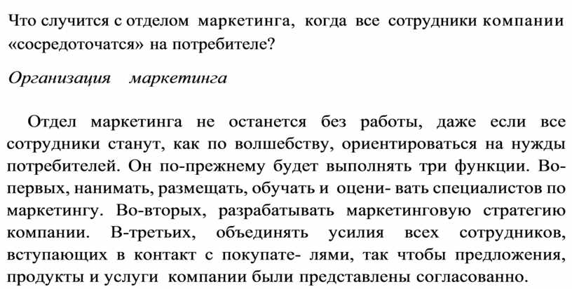Отдел маркетинга не останется без работы, даже если все сотрудники станут, как по волшебству, ориентироваться на нужды потребителей. Он по-прежнему будет выполнять три функции. Во-первых, нанимать, размещать, обучать и оцени вать специалистов по маркетингу. Во-вторых, разрабатывать маркетинговую стратегию компании. В-третьих, объединять усилия всех сотрудников, вступающих в контакт с покупате лями, так чтобы предложения, продукты и услуги компании были представлены согласованно.