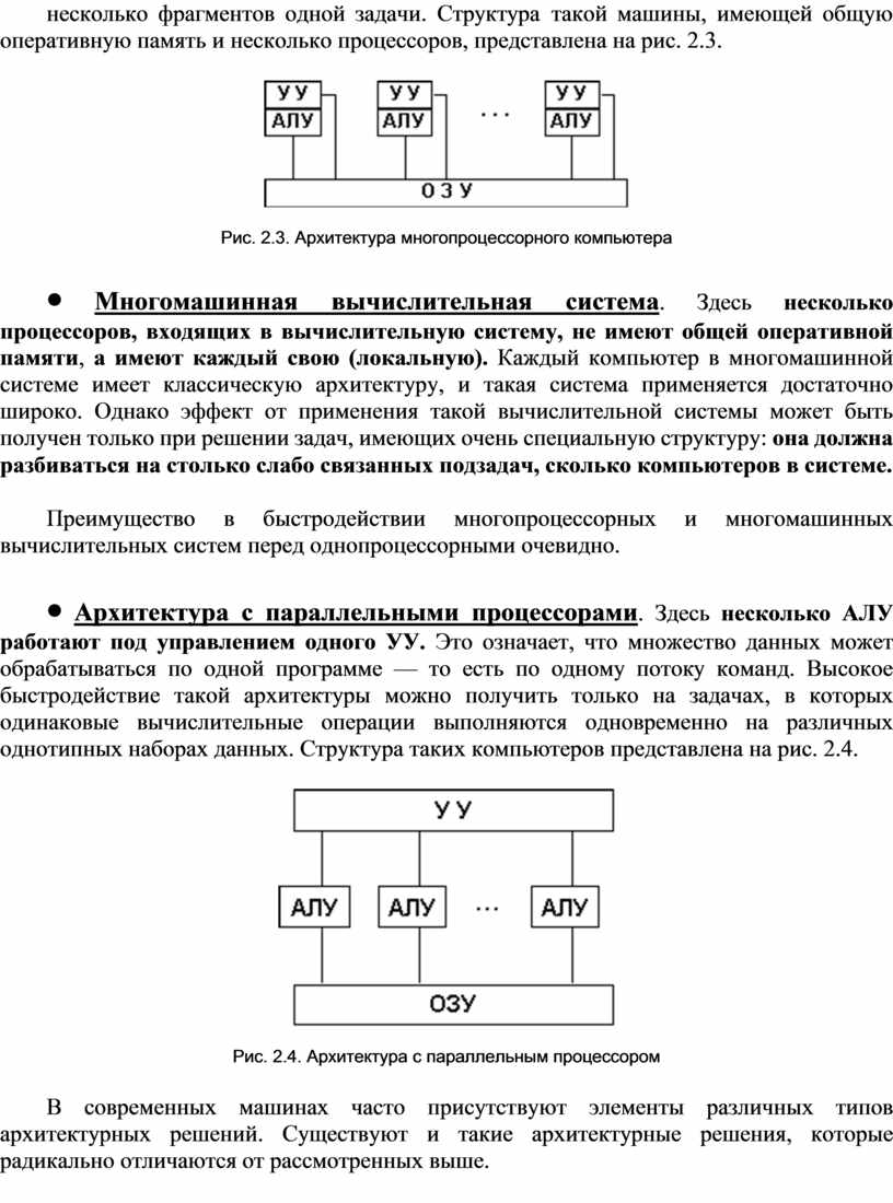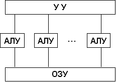 · Архитектура с параллельными процессорами. Здесь несколько АЛУ работают под управлением одного УУ. Это означает, что множество данных может обрабатываться по одной программе — то есть по одному потоку команд. Высокое быстродействие такой архитектуры можно получить только на задачах, в которых одинаковые вычислительные операции выполняются одновременно на различных однотипных наборах данных. Структура таких компьютеров представлена на рис. 2.4.