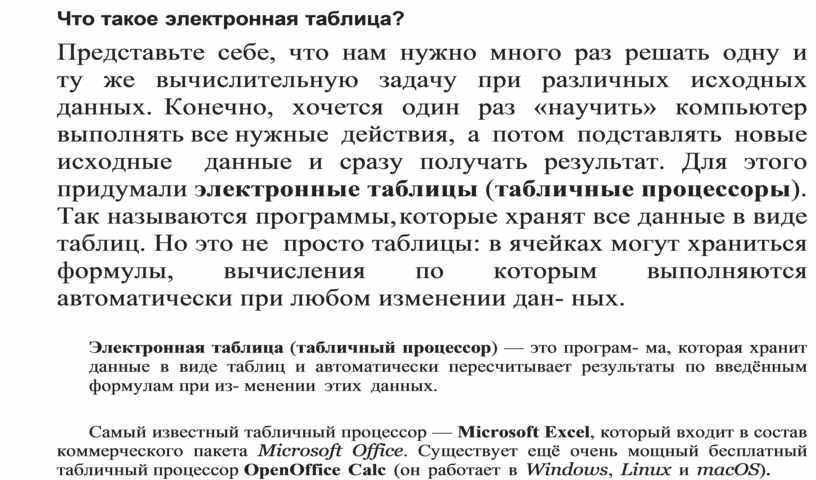 Представьте себе, что нам нужно много раз решать одну и ту же вычислительную задачу при различных исходных данных. Конечно, хочется один раз «научить» компьютер выполнять все нужные действия, а потом подставлять новые исходные данные и сразу получать результат. Для этого придумали электронные таблицы (табличные процессоры). Так называются программы, которые хранят все данные в виде таблиц. Но это не просто таблицы: в ячейках могут храниться формулы, вычисления по которым выполняются автоматически при любом изменении дан- ных.