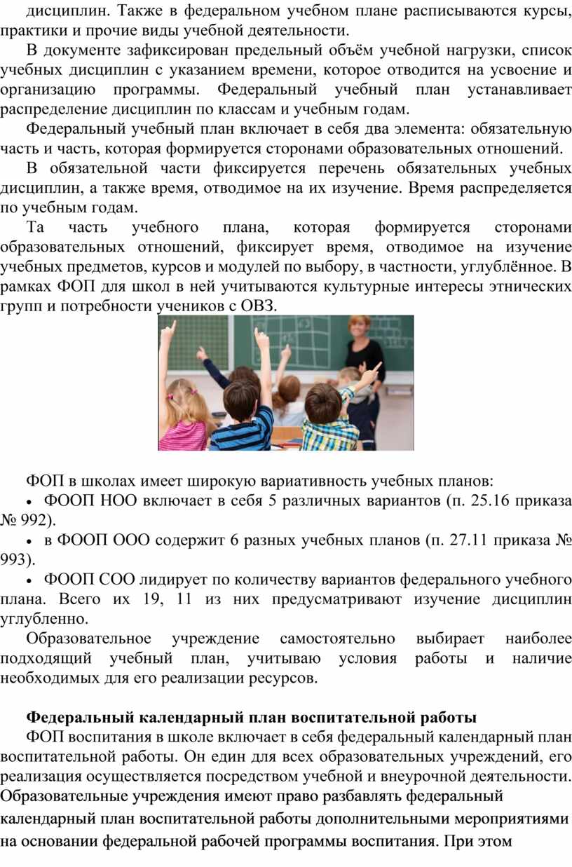 ФОП воспитания в школе включает в себя федеральный календарный план воспитательной работы. Он един для всех образовательных учреждений, его реализация осуществляется посредством учебной и внеурочной деятельности.
