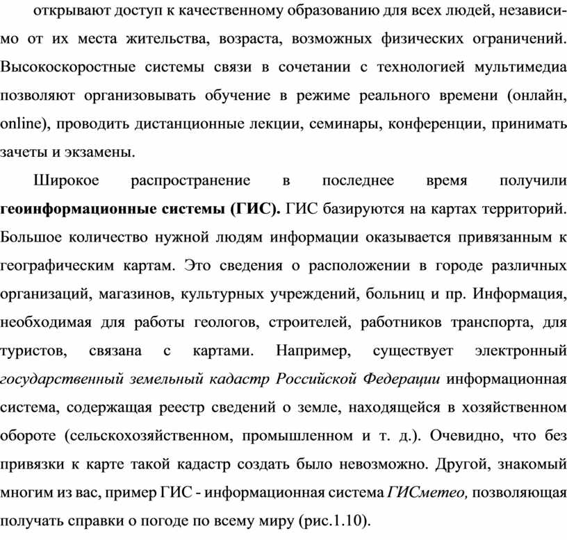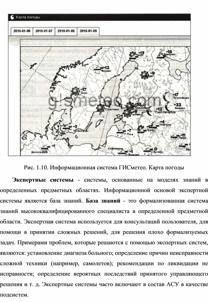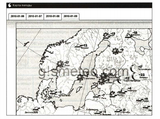 Широкое распространение в последнее время получили геоинформационные системы (ГИС). ГИС базируются на картах территорий. Большое количество нужной людям информации оказывается привязанным к географическим картам. Это сведения о расположении в городе различных организаций, магазинов, культурных учреждений, больниц и пр. Информация, необходимая для работы геологов, строителей, работников транспорта, для туристов, связана с картами. Например, существует электронный государственный земельный кадастр Российской Федерации информационная система, содержащая реестр сведений о земле, находящейся в хозяйственном обороте (сельскохозяйственном, промышленном и т. д.). Очевидно, что без привязки к карте такой кадастр создать было невозможно. Другой, знакомый многим из вас, пример ГИС - информационная система ГИСметео, позволяющая получать справки о погоде по всему миру (рис.1.10).