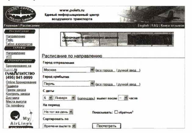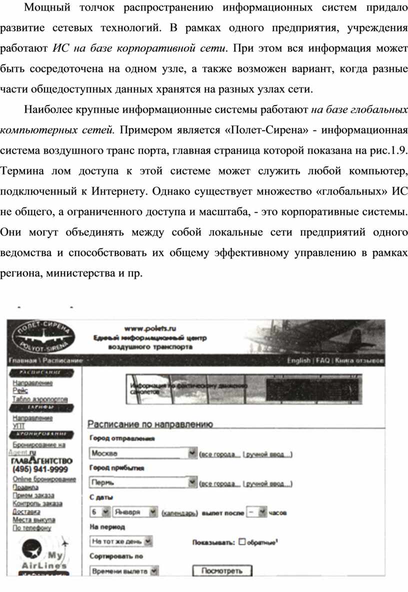 Наиболее крупные информационные системы работают на базе глобальных компьютерных сетей. Примером является «Полет-Сирена» - информационная система воздушного транс порта, главная страница которой показана на рис.1.9. Термина лом доступа к этой системе может служить любой компьютер, подключенный к Интернету. Однако существует множество «глобальных» ИС не общего, а ограниченного доступа и масштаба, - это корпоративные системы. Они могут объединять между собой локальные сети предприятий одного ведомства и способствовать их общему эффективному управлению в рамках региона, министерства и пр.