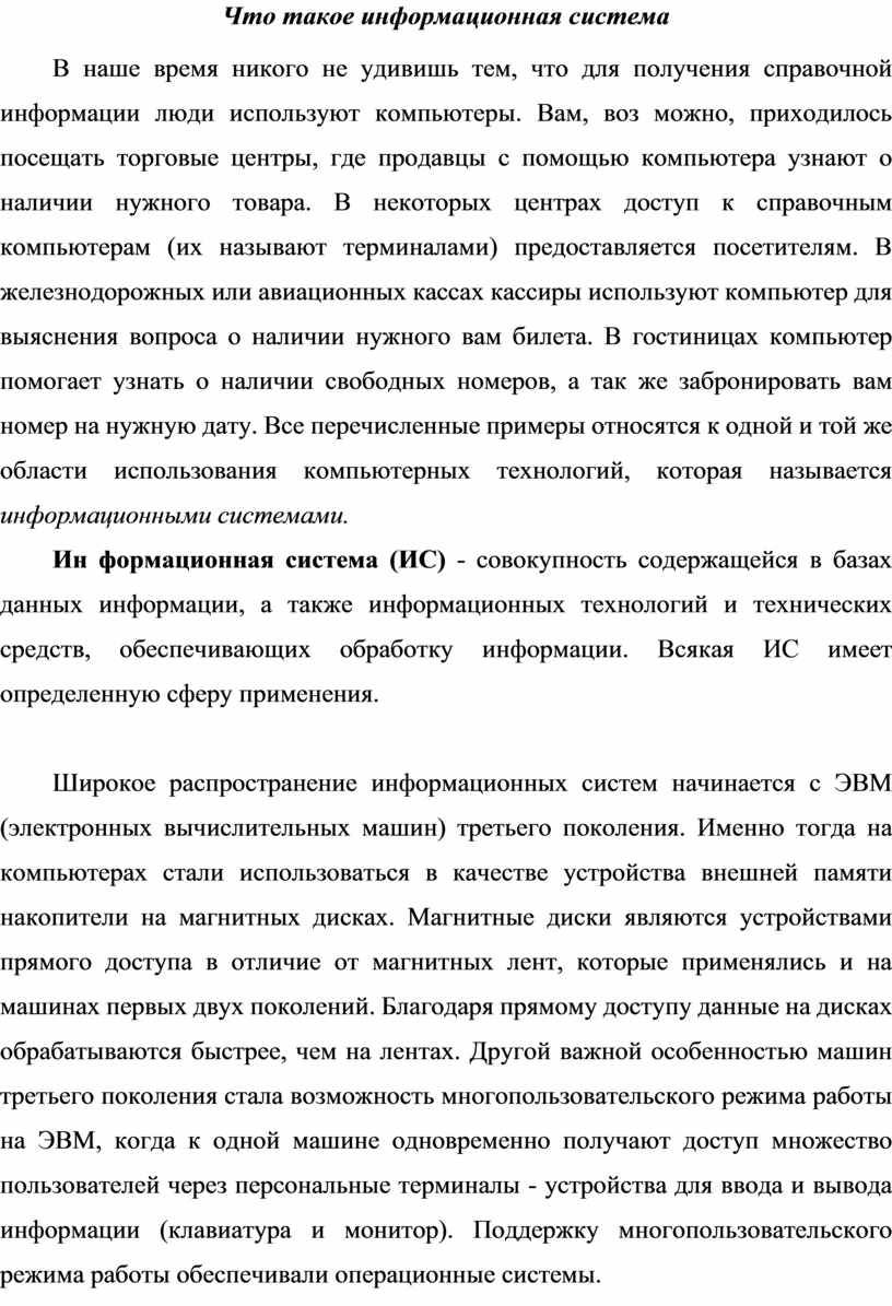 В наше время никого не удивишь тем, что для получения справочной информации люди используют компьютеры. Вам, воз можно, приходилось посещать торговые центры, где продавцы с помощью компьютера узнают о наличии нужного товара. В некоторых центрах доступ к справочным компьютерам (их называют терминалами) предоставляется посетителям. В железнодорожных или авиационных кассах кассиры используют компьютер для выяснения вопроса о наличии нужного вам билета. В гостиницах компьютер помогает узнать о наличии свободных номеров, а так же забронировать вам номер на нужную дату. Все перечисленные примеры относятся к одной и той же области использования компьютерных технологий, которая называется информационными системами.
