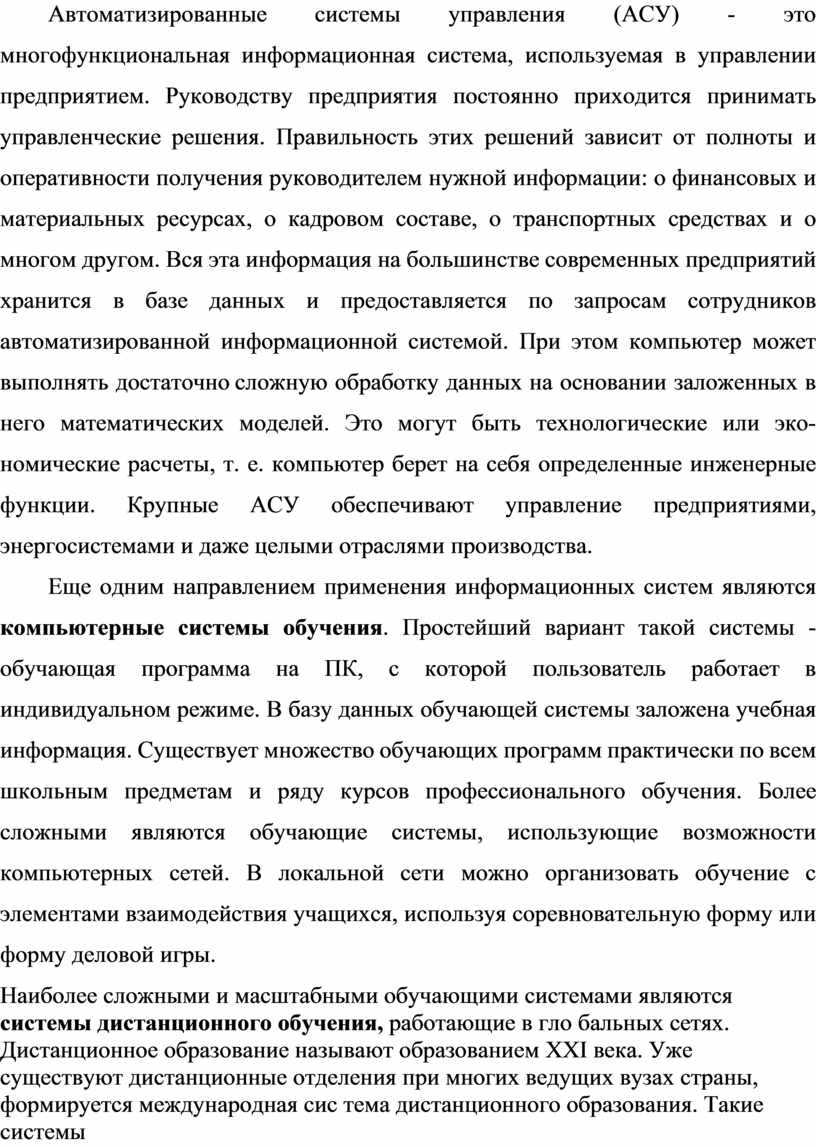 Автоматизированные системы управления (АСУ) - это многофункциональная информационная система, используемая в управлении предприятием. Руководству предприятия постоянно приходится принимать управленческие решения. Правильность этих решений зависит от полноты и оперативности получения руководителем нужной информации: о финансовых и материальных ресурсах, о кадровом составе, о транспортных средствах и о многом другом. Вся эта информация на большинстве современных предприятий хранится в базе данных и предоставляется по запросам сотрудников автоматизированной информационной системой. При этом компьютер может выполнять достаточно сложную обработку данных на основании заложенных в него математических моделей. Это могут быть технологические или экономические расчеты, т. е. компьютер берет на себя определенные инженерные функции. Крупные АСУ обеспечивают управление предприятиями, энергосистемами и даже целыми отраслями производства.