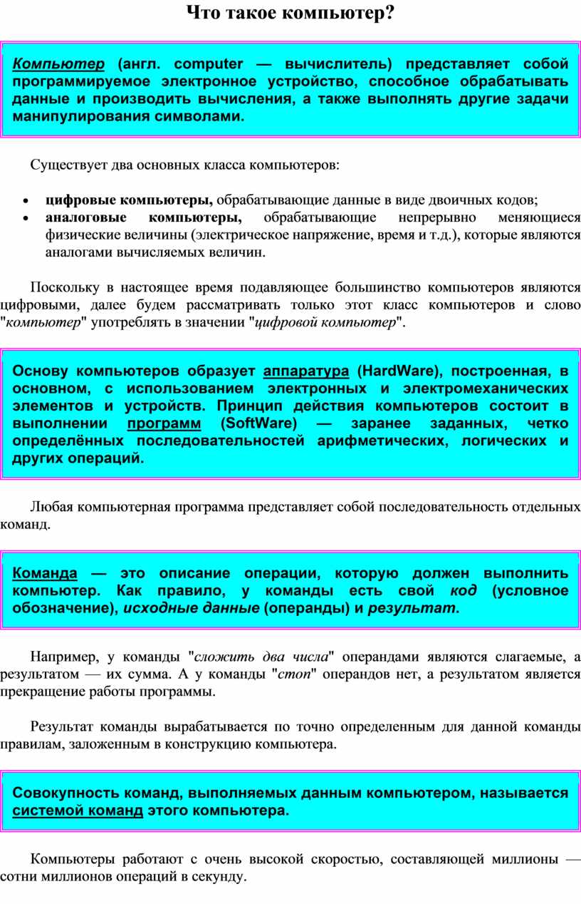 Компьютер (англ. computer — вычислитель) представляет собой программируемое электронное устройство, способное обрабатывать данные и производить вычисления, а также выполнять другие задачи манипулирования символами. |
