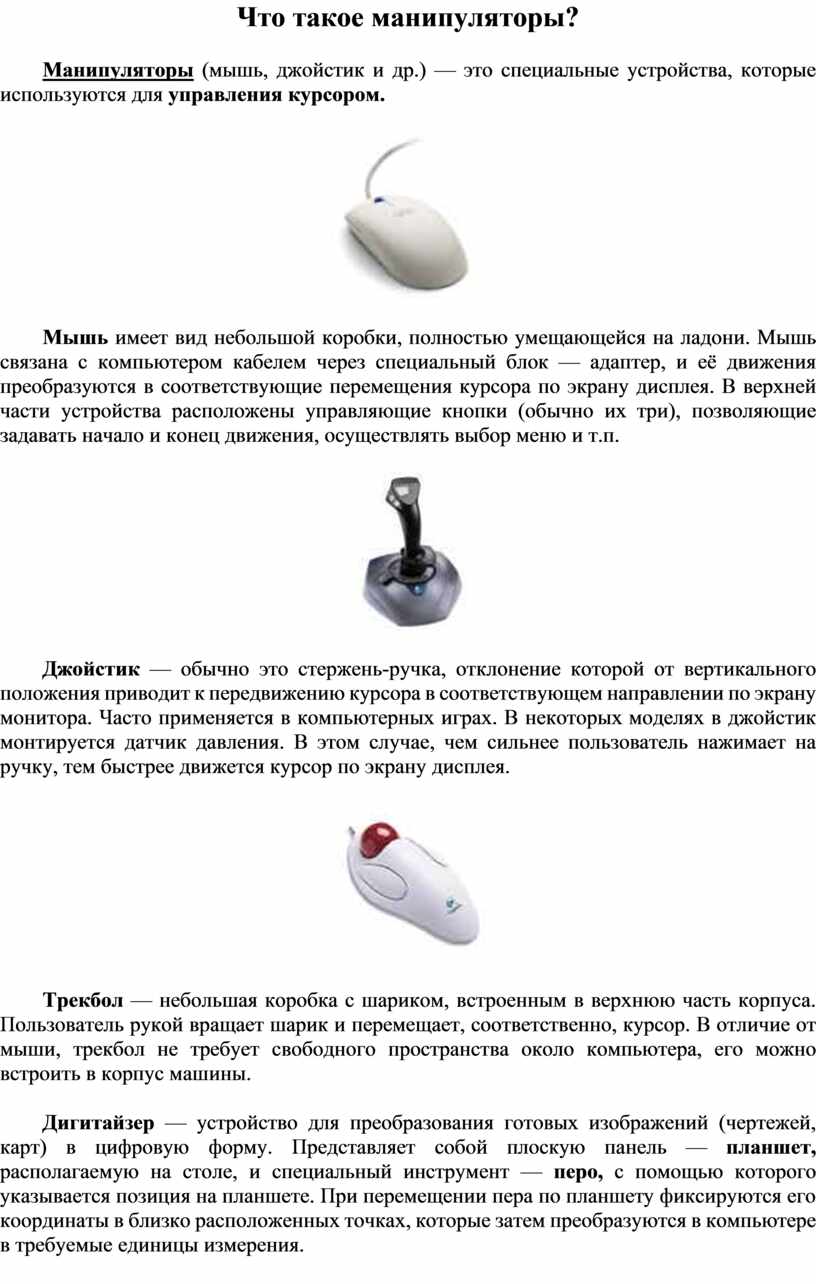 Манипуляторы (мышь, джойстик и др.) — это специальные устройства, которые используются для управления курсором.