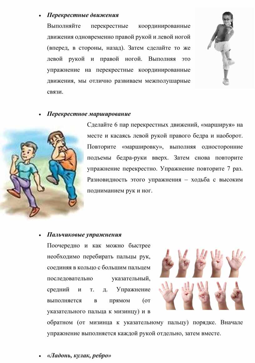 Выполняйте перекрестные координированные движения одновременно правой рукой и левой ногой (вперед, в стороны, назад). Затем сделайте то же левой рукой и правой ногой. Выполняя это упражнение на перекрестные координированные движения, мы отлично развиваем межполушарные связи.