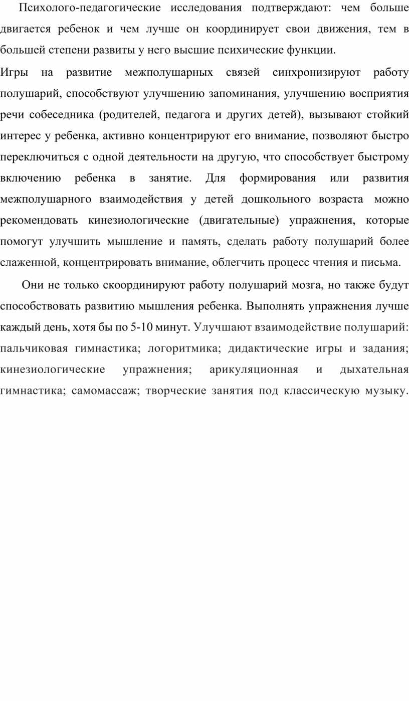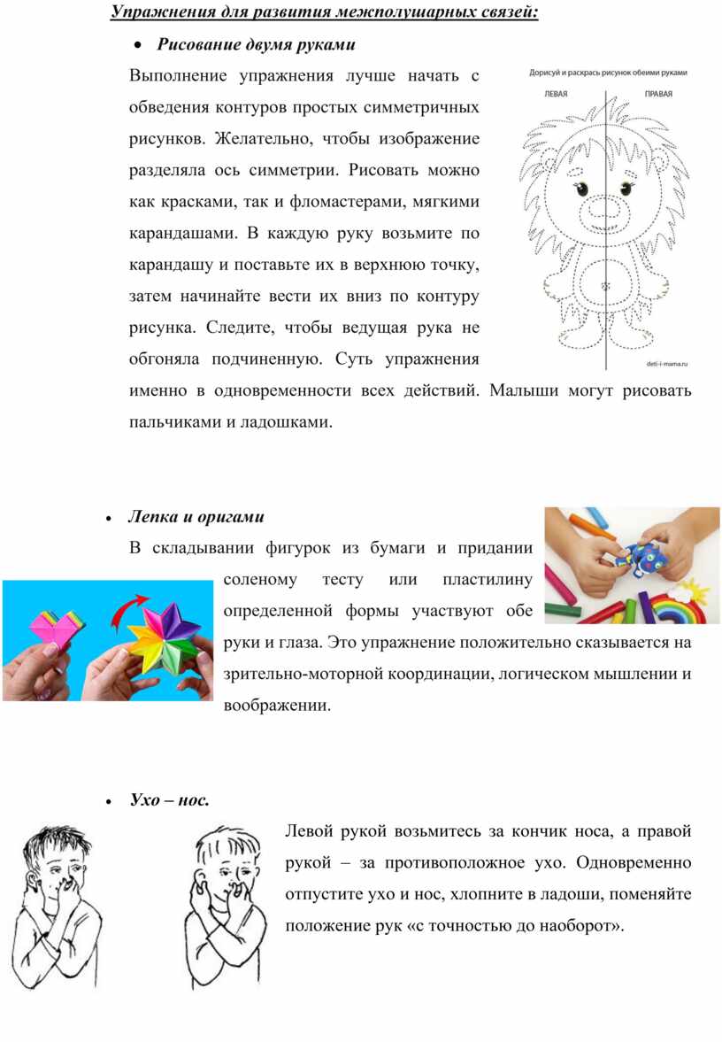 Игры на развитие межполушарных связей синхронизируют работу полушарий, способствуют улучшению запоминания, улучшению восприятия речи собеседника (родителей, педагога и других детей), вызывают стойкий интерес у ребенка, активно концентрируют его внимание, позволяют быстро переключиться с одной деятельности на другую, что способствует быстрому включению ребенка в занятие. Для формирования или развития межполушарного взаимодействия у детей дошкольного возраста можно рекомендовать кинезиологические (двигательные) упражнения, которые помогут улучшить мышление и память, сделать работу полушарий более слаженной, концентрировать внимание, облегчить процесс чтения и письма.