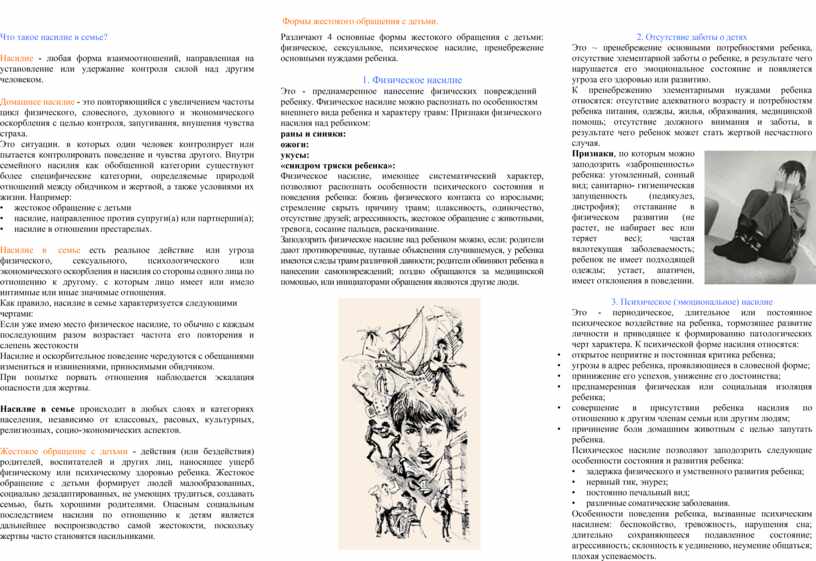 Различают 4 основные формы жестокого обращения с детьми: физическое, сексуальное, психическое насилие, пренебрежение основными нуждами ребенка.