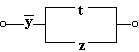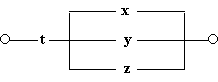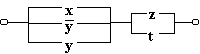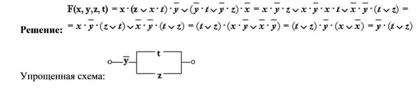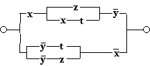 1. Построим схему, содержащую 4 переключателя x, y, z и t, такую, чтобы она проводила ток тогда и только тогда, когда замкнут контакт переключателя t и какой-нибудь из остальных трёх контактов.