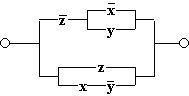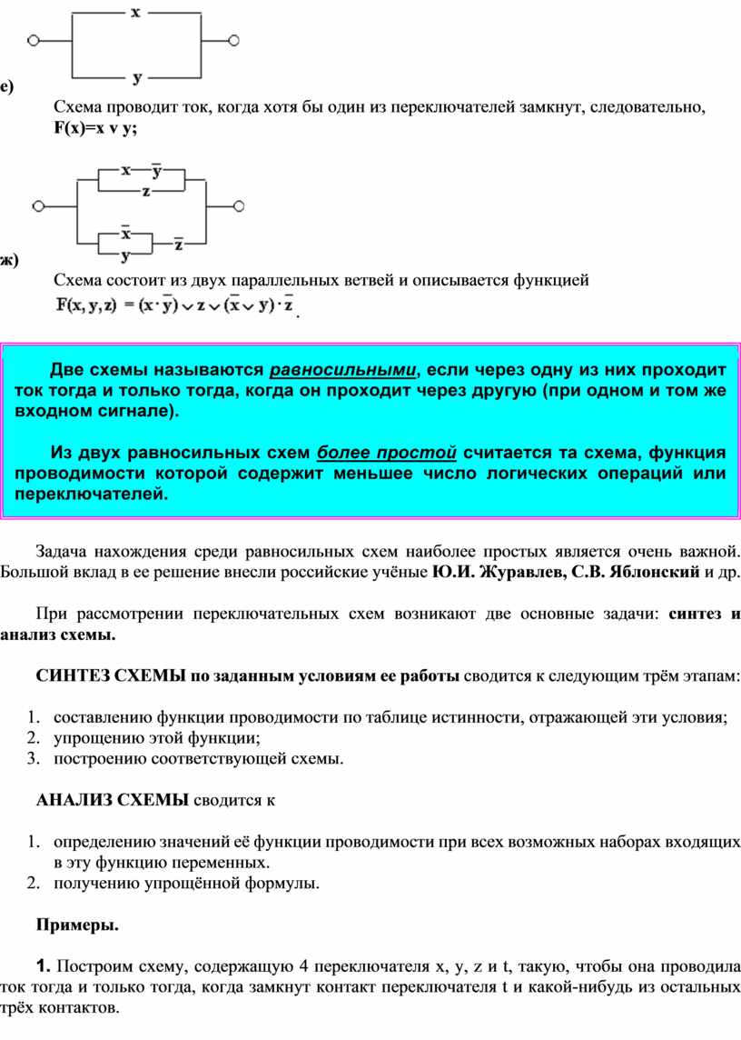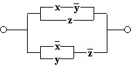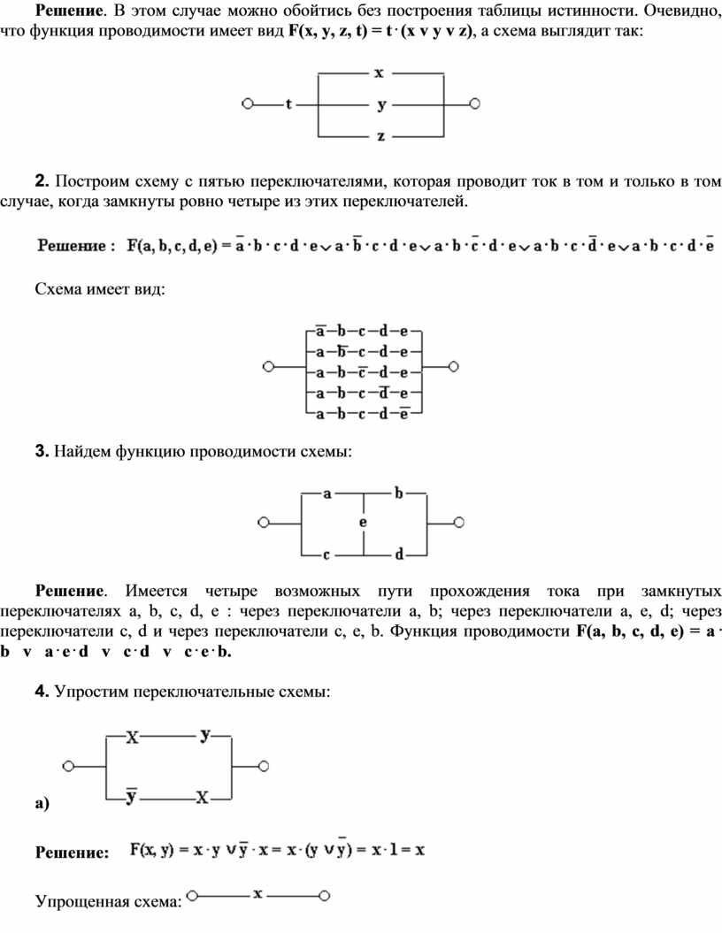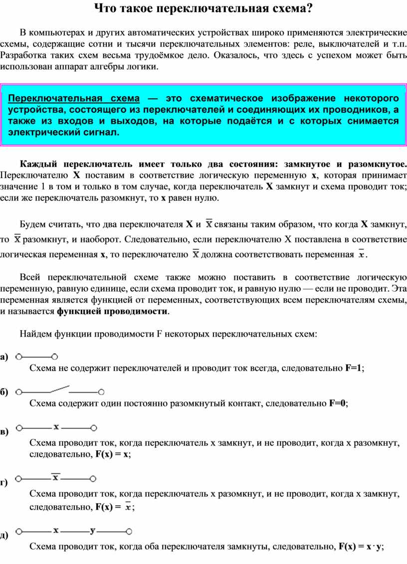 Каждый переключатель имеет только два состояния: замкнутое и разомкнутое. Переключателю Х поставим в соответствие логическую переменную х, которая принимает значение 1 в том и только в том случае, когда переключатель Х замкнут и схема проводит ток; если же переключатель разомкнут, то х равен нулю.