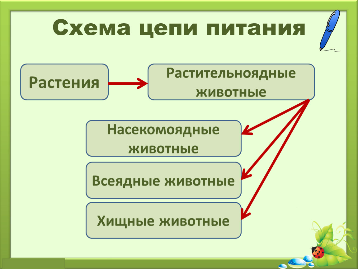 Цепь питания – ряд организмов, в котором каждое предыдущее звено служит пищей следующему.