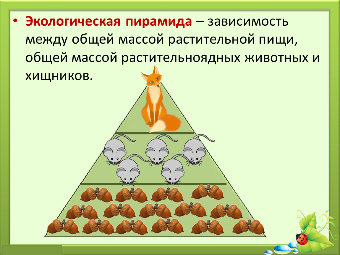 Экологическая пирамида – зависимость между общей массой растительной пищи, общей массой растительноядных животных и хищников.