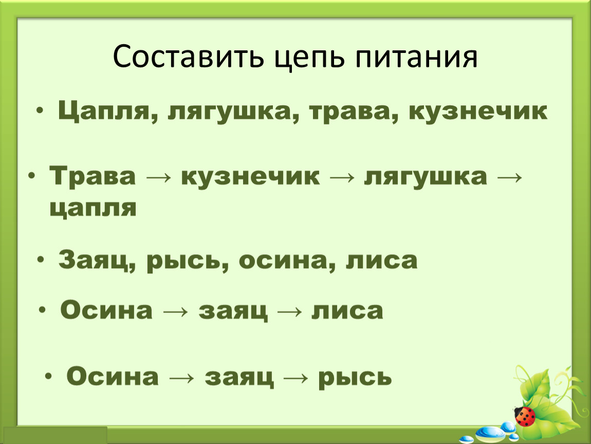 Трава → кузнечик → лягушка → цапля