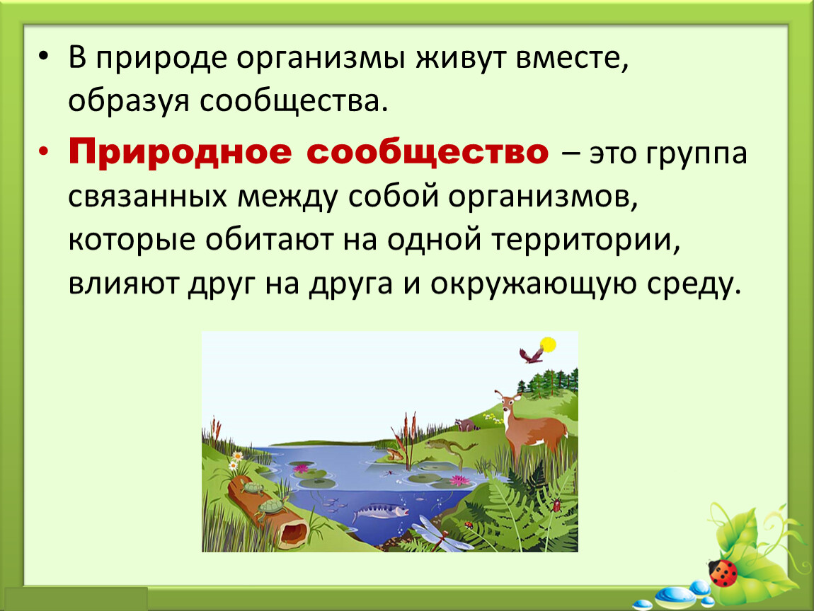Природное сообщество – это группа связанных между собой организмов, которые обитают на одной территории, влияют друг на друга и окружающую среду.