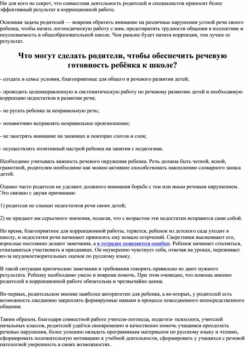 Основная задача родителей — вовремя обратить внимание на различные нарушения устной речи своего ребенка, чтобы начать логопедическую работу с ним, предотвратить трудности общения в коллективе и неуспеваемость в общеобразовательной школе. Чем раньше будет начата коррекция, тем лучше ее результат.