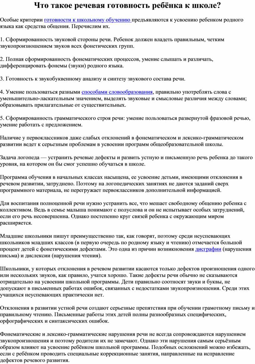 Особые критерии готовности к школьному обучению предъявляются к усвоению ребенком родного языка как средства общения. Перечислим их.