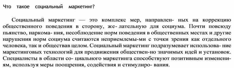 Социальный маркетинг — это комплекс мер, направлен ных на коррекцию общественного поведения в сторону, же лательную для социума. Почти повсюду пьянство, наркома ния, несоблюдение норм поведения в общественных местах и другие нарушения норм социума считаются неприемлемы ми с точки зрения как отдельного человека, так и общества в целом. Социальный маркетинг подразумевает использова ние маркетинговых технологий для продвижения обществен но значимых идей и установок. Специалисты в области со циального маркетинга способствуют позитивным изменени ям, используя меры поощрения, содействия и стимулиро вания.