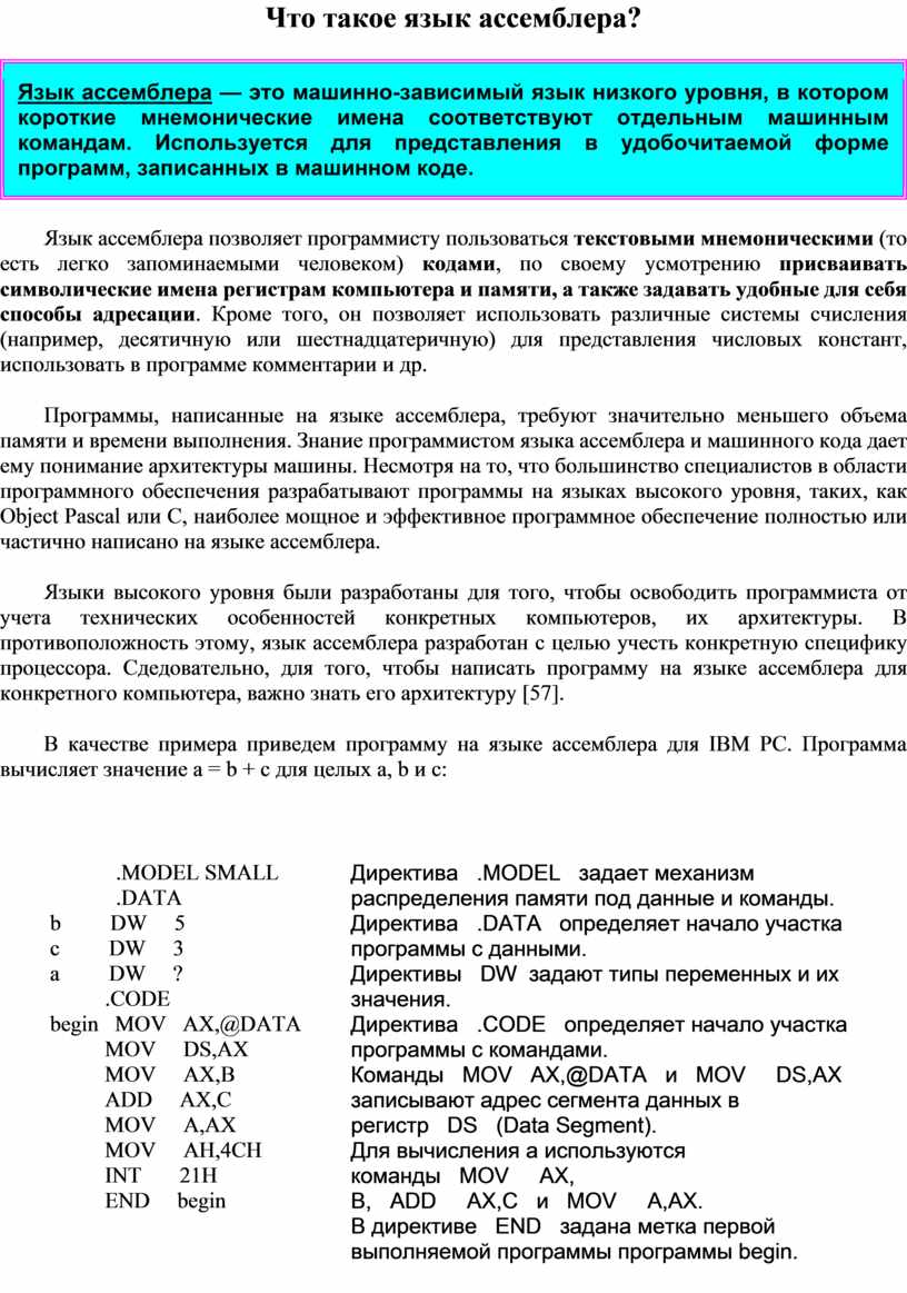 Язык ассемблера — это машинно-зависимый язык низкого уровня, в котором короткие мнемонические имена соответствуют отдельным машинным командам. Используется для представления в удобочитаемой форме программ, записанных в машинном коде. |
