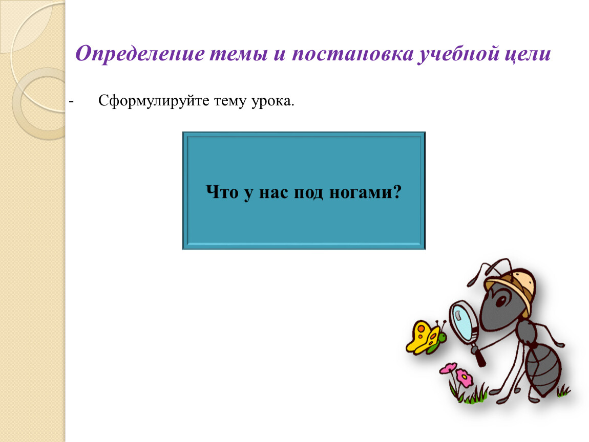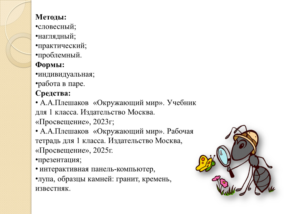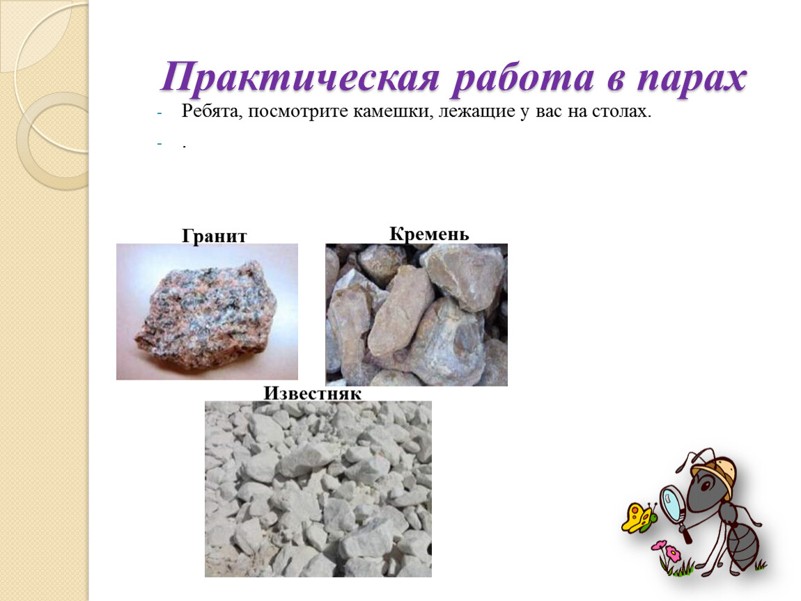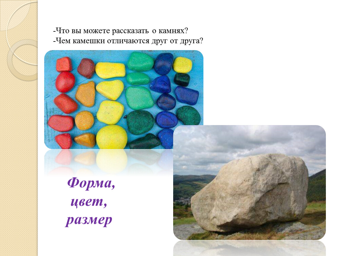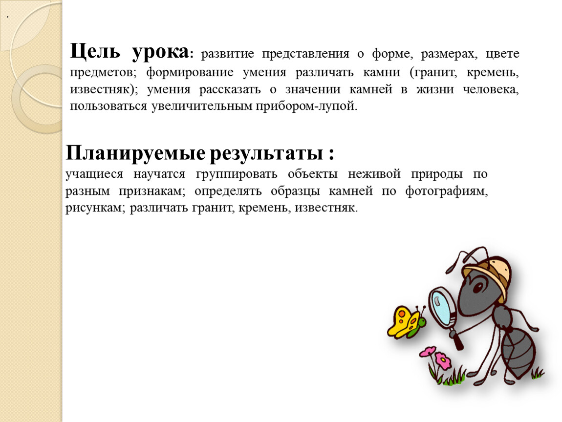 Цель урока: развитие представления о форме, размерах, цвете предметов; формирование умения различать камни (гранит, кремень, известняк); умения рассказать о значении камней в жизни человека, пользоваться увеличительным прибором-лупой.