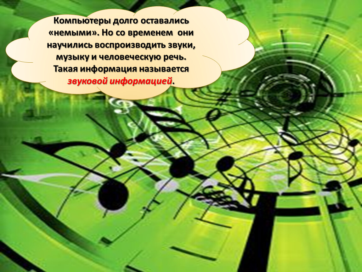 Компьютеры долго оставались «немыми». Но со временем они научились воспроизводить звуки, музыку и человеческую речь. Такая информация называется звуковой информацией.