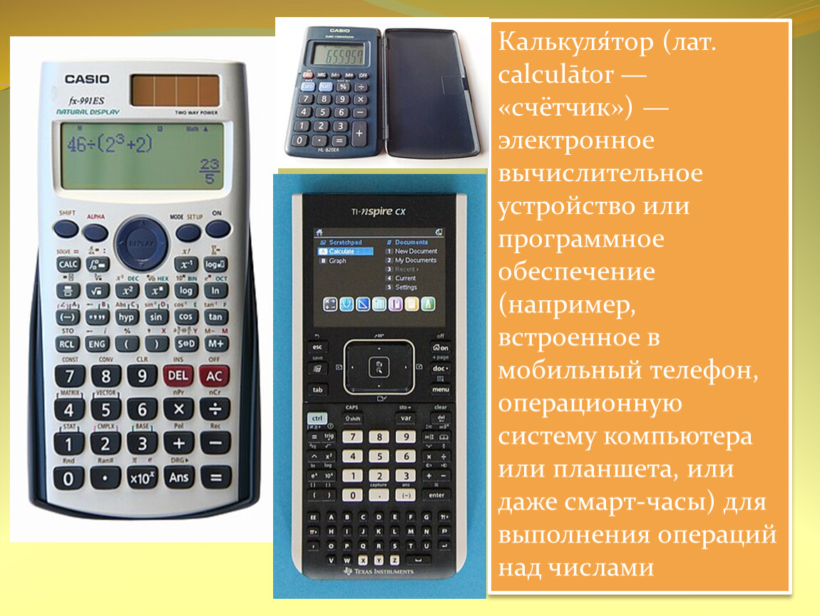 Калькуля́тор (лат. calculātor — «счётчик») — электронное вычислительное устройство или программное обеспечение (например, встроенное в мобильный телефон, операционную систему компьютера или планшета, или даже смарт-часы) для выполнения операций над числами