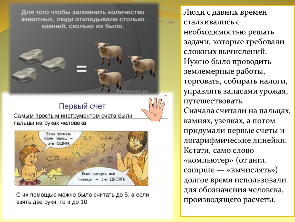 Люди с давних времен сталкивались с необходимостью решать задачи, которые требовали сложных вычислений. Нужно было проводить землемерные работы, торговать, собирать налоги, управлять запасами урожая, путешествовать.