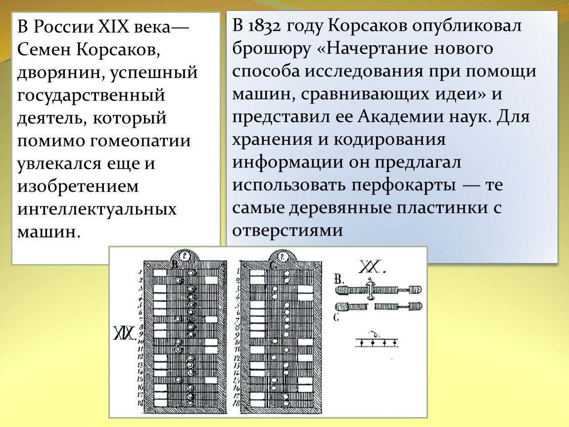 В 1832 году Корсаков опубликовал брошюру «Начертание нового способа исследования при помощи машин, сравнивающих идеи» и представил ее Академии наук. Для хранения и кодирования информации он предлагал использовать перфокарты — те самые деревянные пластинки с отверстиями