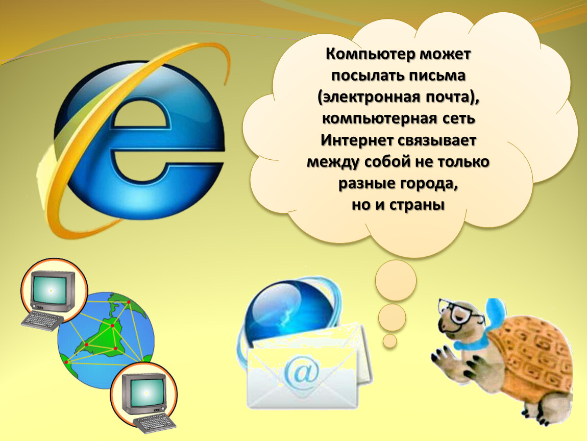 Компьютер может посылать письма (электронная почта), компьютерная сеть Интернет связывает между собой не только разные города, но и страны