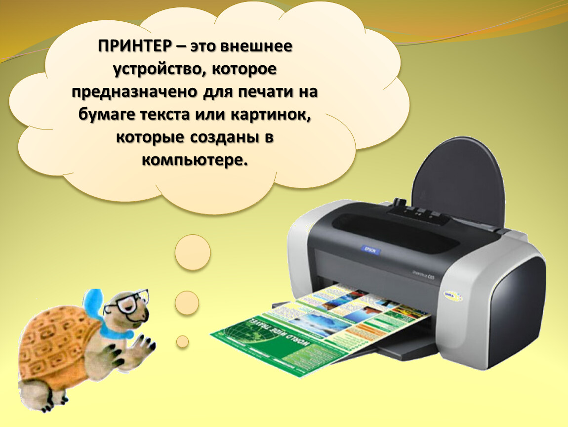 ПРИНТЕР – это внешнее устройство, которое предназначено для печати на бумаге текста или картинок, которые созданы в компьютере.