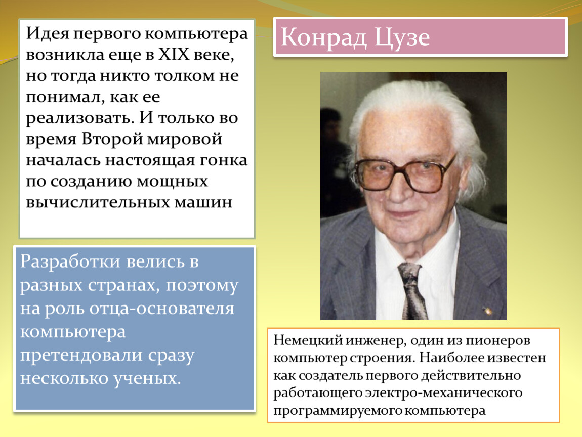 Разработки велись в разных странах, поэтому на роль отца-основателя компьютера претендовали сразу несколько ученых.