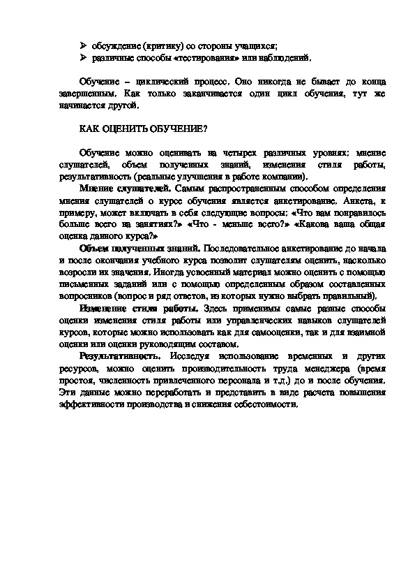 Обучение можно оценивать на четырех различных уровнях: мнение