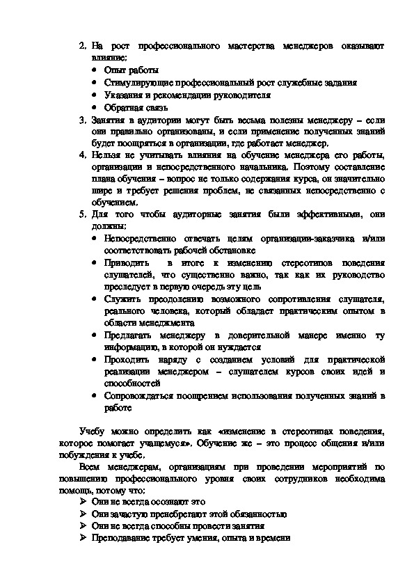 им необходимо обучиться и будут ли они этому учиться.2. На рост профессионального мастерства менеджеров оказывают