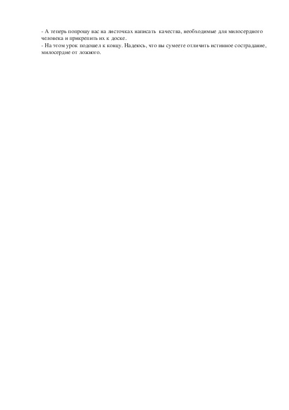 Ребята, как вы считаете, надо ли быть милосердным? Сострадательным? А теперь попрошу вас на листочках написать качества, необходимые для милосердного