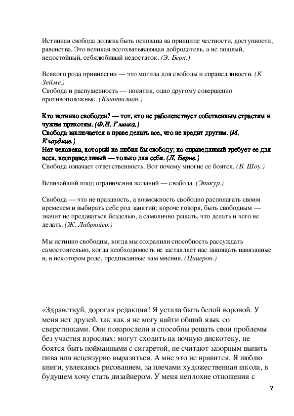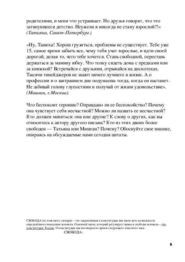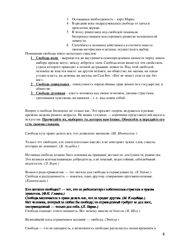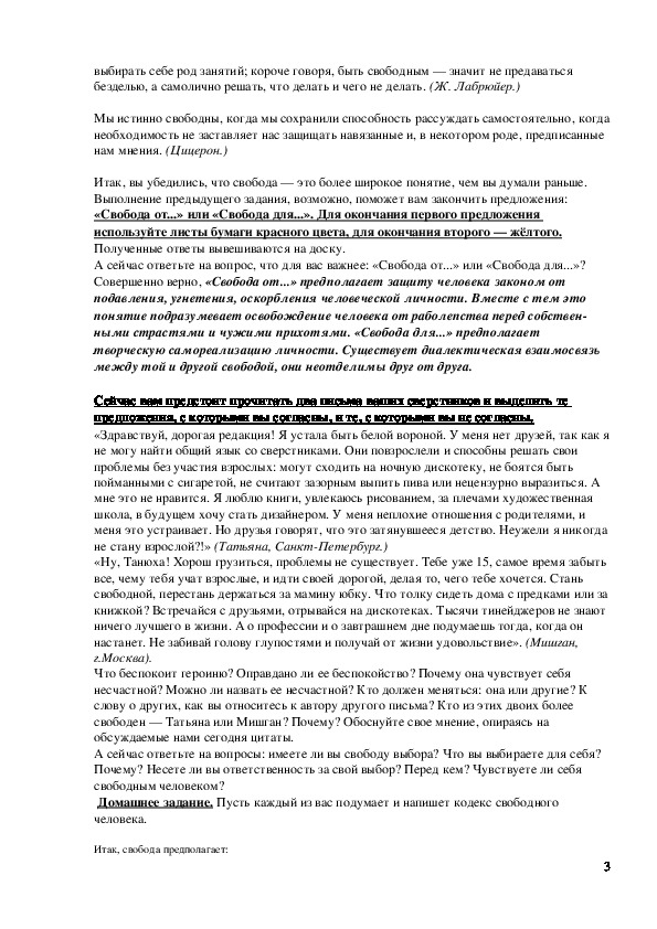 1. За 1—2 недели до проведения занятия сообщить учащим¬ся тему и предложить подумать о понятии «свобода».