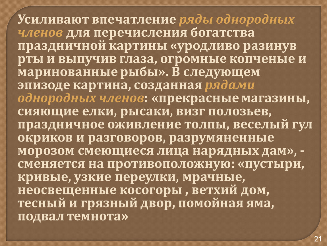 Усиливают впечатление ряды однородных членов для перечисления богатства праздничной картины «уродливо разинув рты и выпучив глаза, огромные копченые и маринованные рыбы». В следующем эпизоде картина, созданная рядами однородных членов: «прекрасные магазины, сияющие елки, рысаки, визг полозьев, праздничное оживление толпы, веселый гул окриков и разговоров, разрумяненные морозом смеющиеся лица нарядных дам», - сменяется на противоположную: «пустыри, кривые, узкие переулки, мрачные, неосвещенные косогоры , ветхий дом, тесный и грязный двор, помойная яма, подвал темнота»