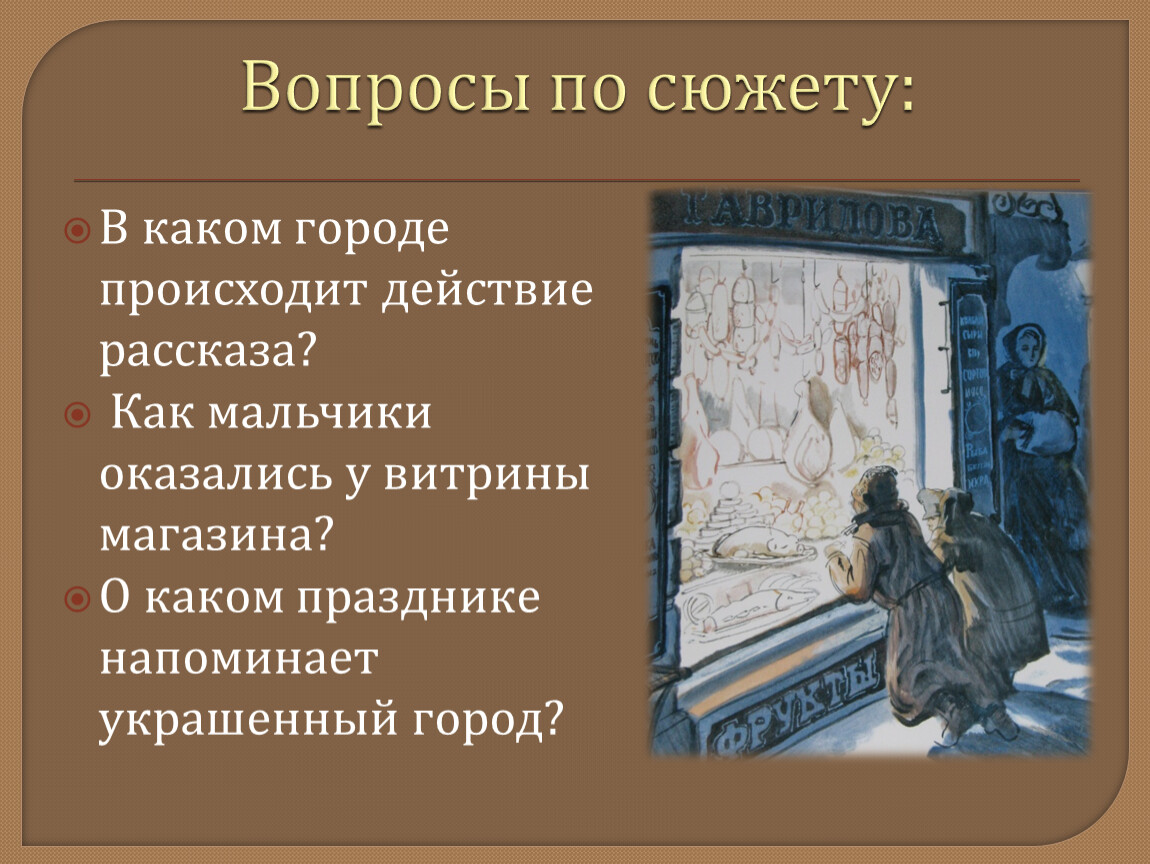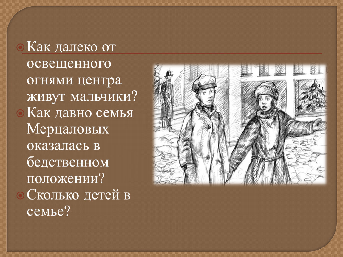 Выразительные эпитеты: магазины «прекрасные», елки «сияющие», оживление «праздничное» переулки «кривые», косогоры «мрачные», дом «ветхий», покоившийся» - ярче помогают увидеть контраст между богатством и бедностью, радостью и горем. Из многоцветного праздничного мира, похожего на рай, мальчики возвращаются в подвал, в тусклую обыденность, напоминающую ад.