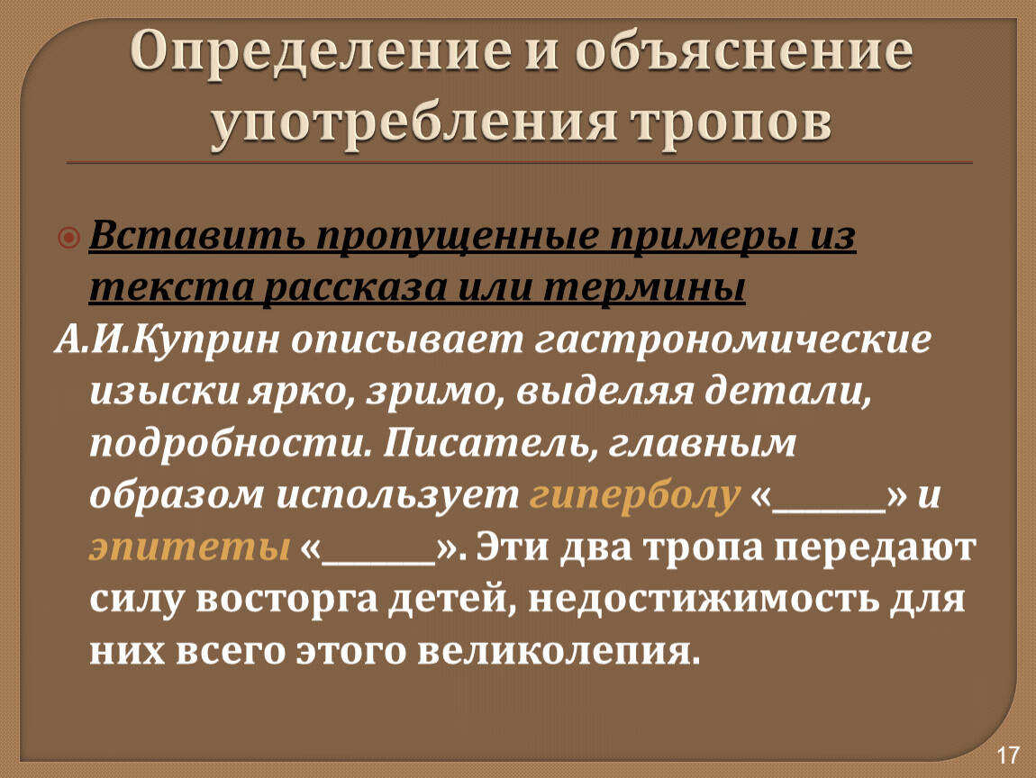 А.И.Куприн описывает гастрономические изыски ярко, зримо, выделяя детали, подробности. Писатель, главным образом использует гиперболу «_______» и эпитеты «_______». Эти два тропа передают силу восторга детей, недостижимость для них всего этого великолепия.