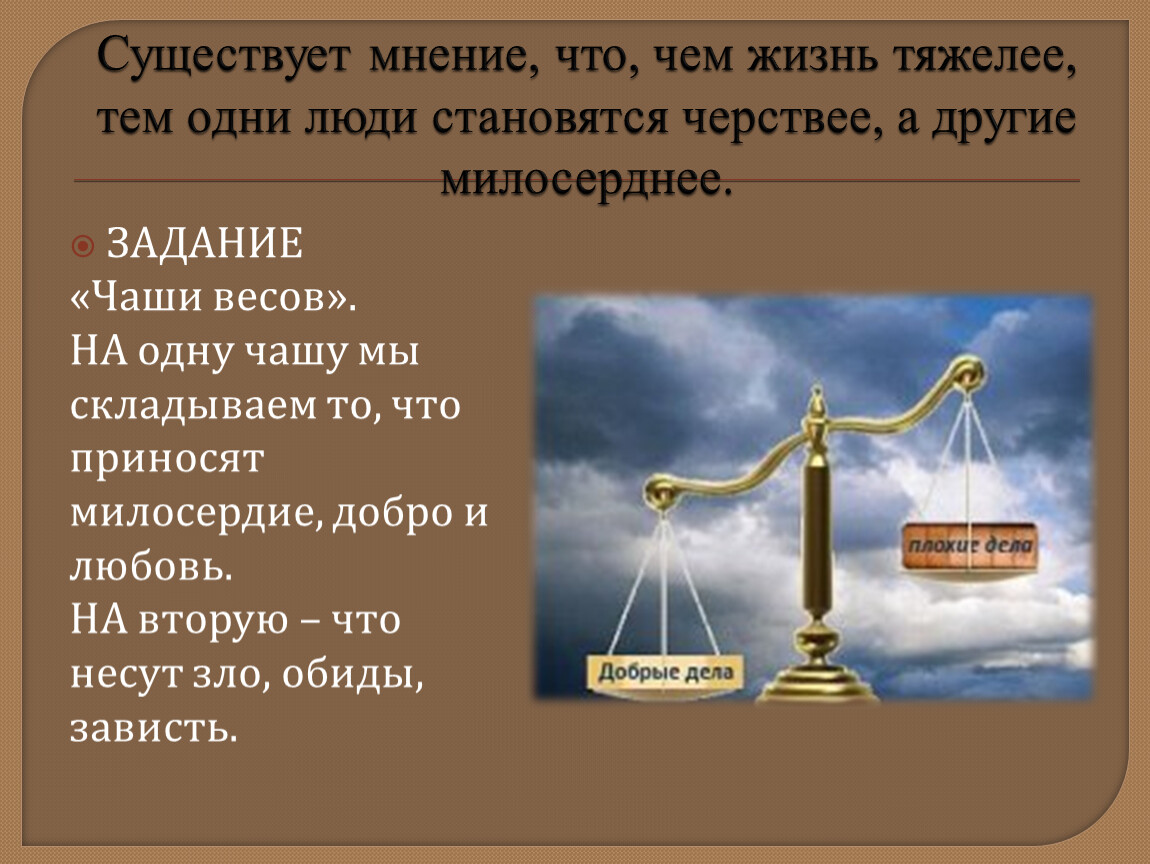 НА одну чашу мы складываем то, что приносят милосердие, добро и любовь.