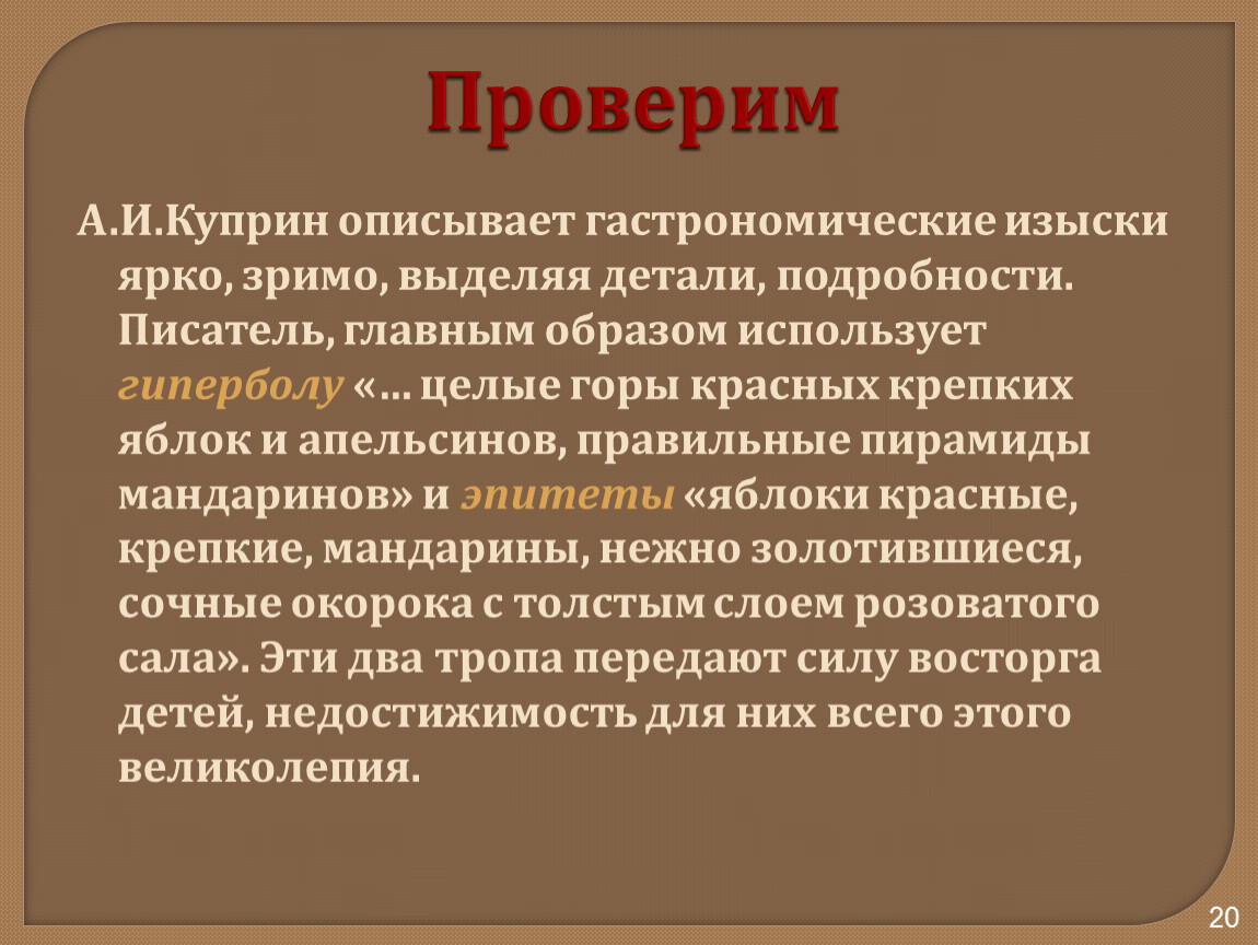 А.И.Куприн описывает гастрономические изыски ярко, зримо, выделяя детали, подробности. Писатель, главным образом использует гиперболу «… целые горы красных крепких яблок и апельсинов, правильные пирамиды мандаринов» и эпитеты «яблоки красные, крепкие, мандарины, нежно золотившиеся, сочные окорока с толстым слоем розоватого сала». Эти два тропа передают силу восторга детей, недостижимость для них всего этого великолепия.